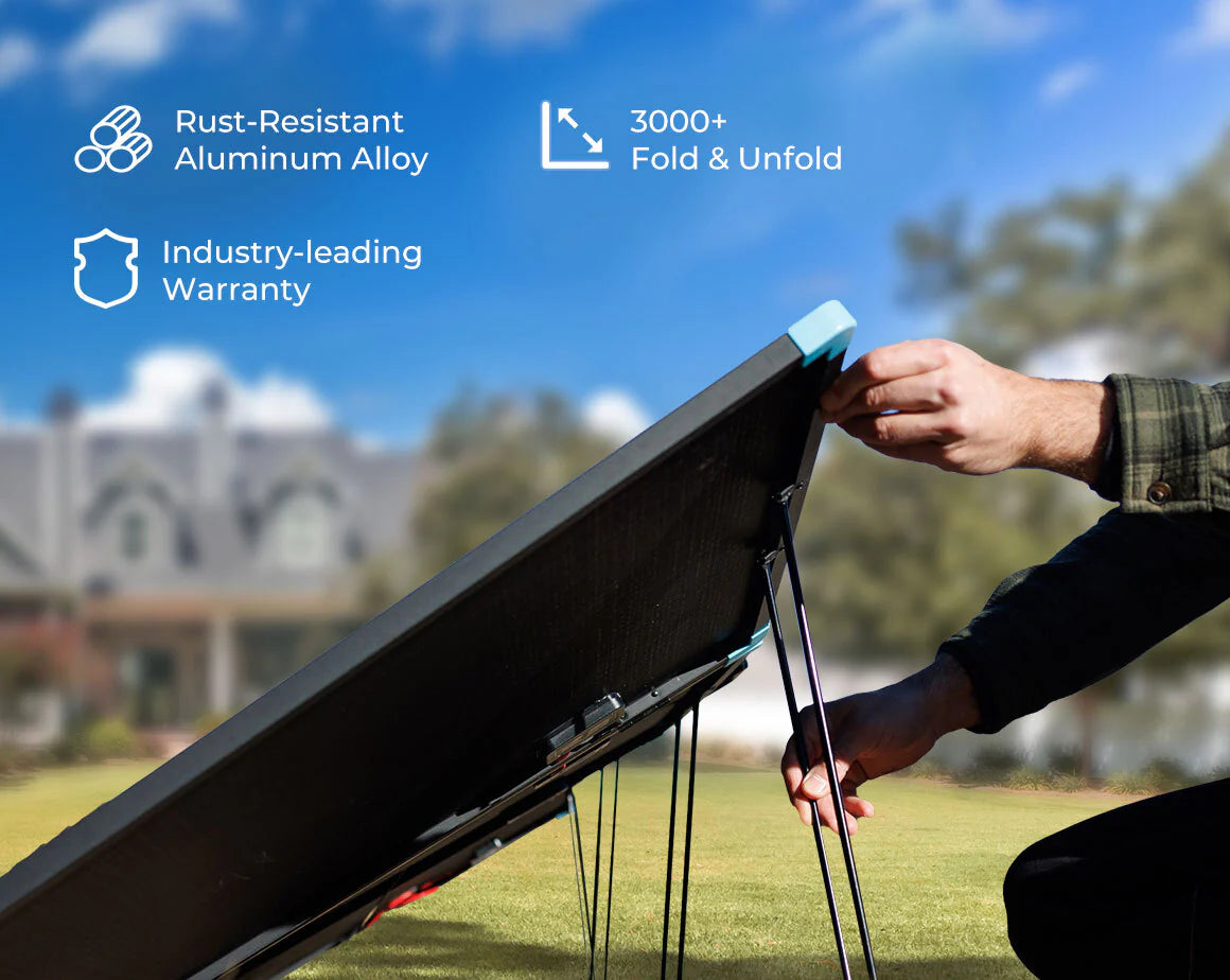 This high-wattage solar suitcase is lightweight, portable, and supported by robust kickstands for durability.